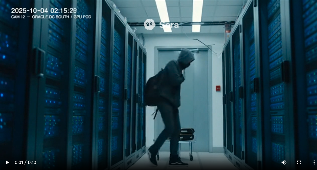 sora2 这边有比较有趣,给了监控视频的时间,保安还发现了sam,还有对话。